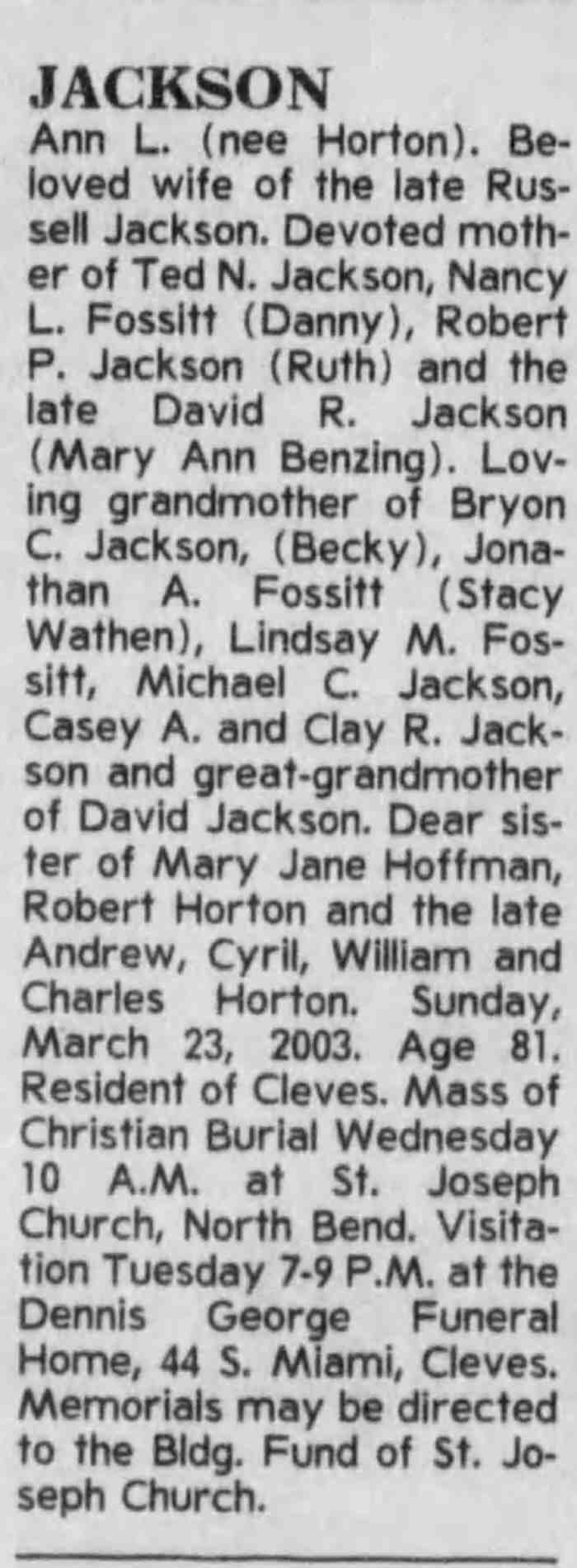 L. Fossltt (Danny). Robert P. Jackson (Ruth) and the late David R. Jackson (Mary Ann Benzing). Loving grandmother of Bryon C. Jackson, (Becky), Jonathan A. Fosstt (Stacy Wathen), Lindsay M. Fossitt, Michael C. Jackson, Casey A. and Clay R. Jackson and great-grandmother of David Jackson. Dear sister of Mary Jane Hoffman, Robert Horton and the late Andrew, Cyril, William and Charles Horton. Sunday, March 23, 2003. Age 81. Resident of Cleves. Mass of Christian Burial Wednesday 10 A.M. at St. Joseph Church, North Bend. Visitation Tuesday 7-9 PM. at the Dennis George Funeral Home, 44 S. Miami, Cleves. Memorials may be directed to the Bldg. Fund of St. Joseph Church.