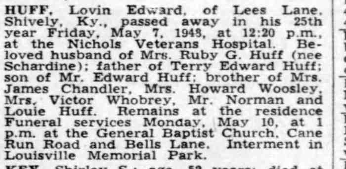 HUFF, Lovin Edward, of Lees Lane, Shively, Ky., passed away in his 25th year Friday, May 7, 1948, at 12:20 p.m., at the Nichols Veterans Hospital. Beloved husband of Mrs. Ruby G. Huff (nee Schardine); father of Terry Edward Huff; son of Mr. Edward Huff; brother of Mrs. James Chandler, Mrs. Howard Woosley, Mrs. Victor Whobrey, Mr. Norman and Louie Huff. Remains at the residence. Funeral services Monday. May 10. at 1 p.m. at the General Baptist Church, Cane Run Road and Bells Lane. Interment in