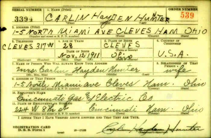 Carlin Hayden Hunter is 28 years old, born Nov. 12, 1911 in Cleves, Ohio. He resides at 1-5 North Mami Ave, Cleves, Hamilton, Ohio. The person who will always know his address is his wife, Mrs. Carlin Hayden Hunter, same current address. Carlin works for Cincinnati Gas & Electric Co., 224 W. 8th St., Cincinnati, Hamilton, Ohio. Carlin is described as white race, 6'1" tall, 140 lbs., blue eyes, blonde hair, light complexion.
