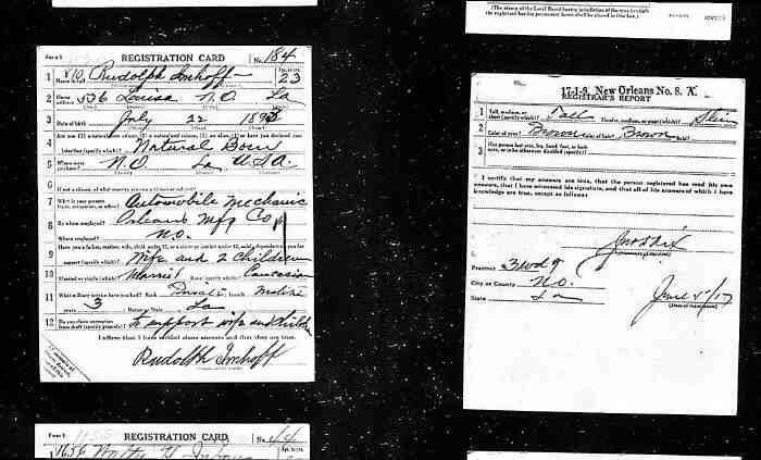 Rudolph Imhoff is 23 years old, born July 22, 1893 in New Orleans, La. He resides at 506 Louisa, New Orleans, Louisiana. His present occupation is auto mechanic for Orleans Mfg. Co in New Orleans. A married caucasian, he has a wife and 2 children, for whom he now claims exemption from draft.. He has served 3 years as a private in the militia. He is described as tall, slim, brown eyes and brown hair.