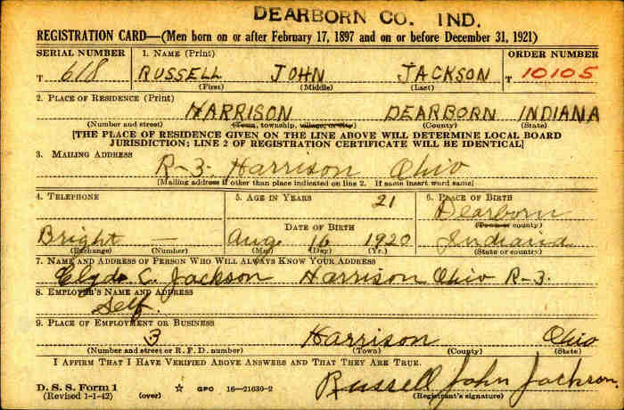 Russell John Jackson is 21 years old, born Aug 16, 1920 in Bright, Dearborn, Indiana. His current mailing address is R-3 Harrison Ohio. The person who will always know his address is Clyde C. Jackson, same address. Russell is self employed, at 3, Harrison, Ind. He is described as white, 5'11", 162 lbs, blue eyes, blonde hair, light complexion.