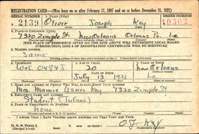 Oliver Joseph Key is 20 years old, born July 13, 1921 in New Orleans, La. He resides at 7320 Zimple St., New Orleans, Orleans, Louisiana, and his phone number is Wal 04845. The person who will always know his address is Mrs. Mamie Usner Key, same current residence. He is not employed, as he is a student at Tulane. He is described as white race, 6'3" tall, 205 lbs., brown eyes, brown hair, light complexion.