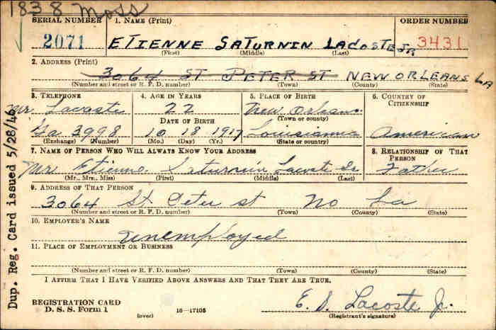 Etienne Saturnin Lacoste, Jr. is 22 years old, born 10-18-1917 in New Orleans, Louisiana. He resides at 3064 St. Peter St., New Orleans, LA, and his phone number is Ga 3998. The person who will always know his address is his father, Mr. Etienne Saturnin, Sr. who resides at the same address. Occupation is unemployed. Etienne is described as white race, 5'7" tall, 158 lbs., brown eyes, black hair, ruddy complexion. The tip of his first index finger of his right hand is chopped off.