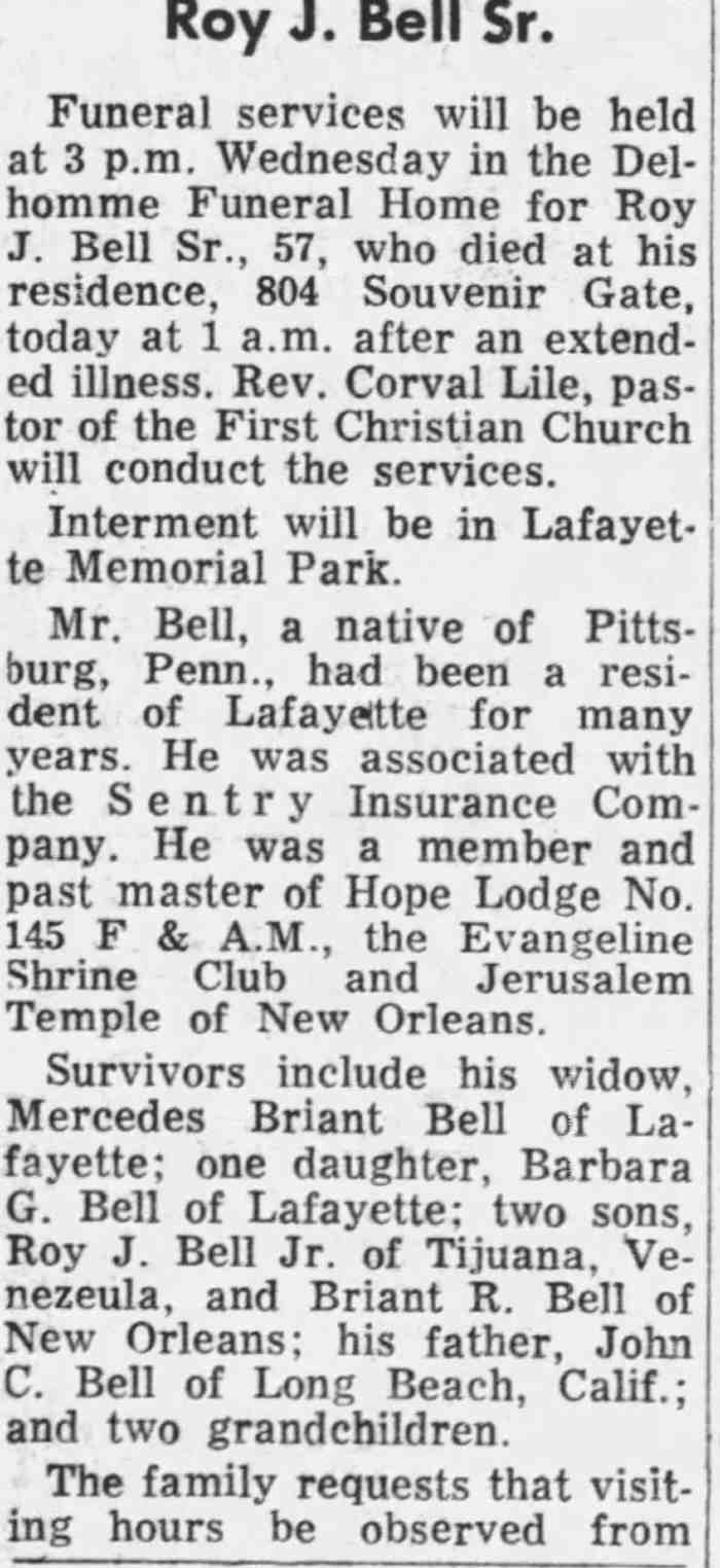 Survivors include his widow, Mercedes Briant Bell of Lafayette; one daughter, Barbara G. Bell of Lafayette; two sons, Roy J. Bell Jr. of Tijuana, Venezeula, and Briant R. Bell of New Orleans: his father, John C. Bell of Long Beach, Calif.; and two grandchildren.