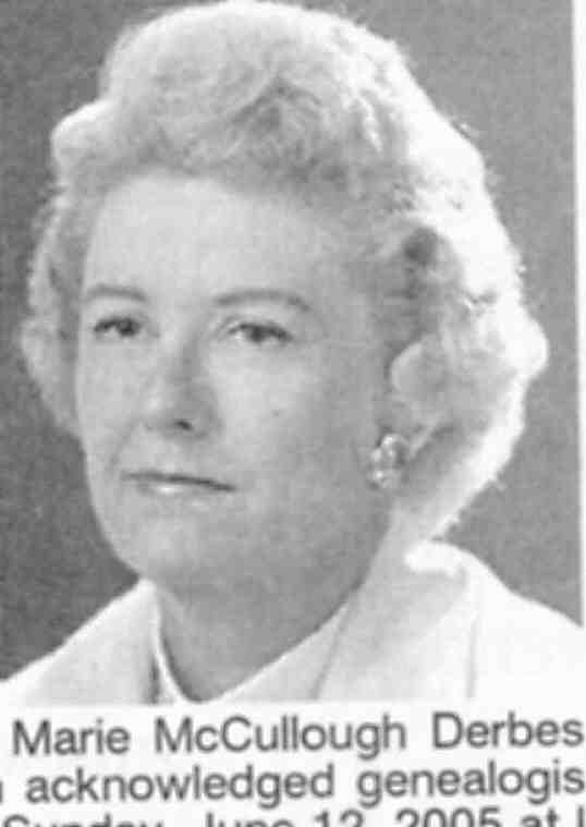 DERBES Kathleen Marie McCullough Derbes, age 80 years, an acknowledged genealogist passed away on Sunday, June 12, 2005 at Lakeview Regional Medical Center, Covington, LA. Mrs. Derbes had published a paternal family genealogy book entitled ""David Shields McCullough and Anne Jane Smith'' and she made major contributions to the ""Derbes Family'' book published by Vincent J. Derbes and Bertrand Paquet in addition to numerous other projects. She had attended Newcomb College. She served for many years as the Registrar of the Daughters of the American Revolution in Covington. She was also a member of Colonial Dames XVII, United Daughters of the Confederacy and the Magna Charta Dames. She was a parishioner of Our Lady of the Lake Catholic Church in Mandeville. She was born in Decatur, Georgia, and had resided in the New Orleans area since 1942 and been a resident of Covington since 1960. She was the daughter of the late David F. McCullough and Kathleen Platt and the beloved wife of the late Maxime J. Derbes, Jr. for 61 years. Mrs. Derbes was the mother of Maxime J. Derbes III and David Stephen Derbes and the grandmother of Michelle Marie, Alexander Benjamin, Zachary John, David Stephen, Jr. and Christine Claire Derbes and Lori D. Rowe and three great-grandchildren, Emily Rowe, Mia Derbes and Isabel Derbes. She was the step-grandmother of Ashlee and Stuart Galvis, and Ryan, Mimi and Reed Duncan. Relatives and friends of the family are invited to attend the Funeral Mass on Thursday, June 16, 2005 from the Chapel of E. J. Fielding Funeral Home, Inc., 2260 W. 21st Ave., Covington, LA at 3:00 PM. Friends may visit from 1:00 PM until service time. Interment will be private. Memorials in her honor to the Fairhaven Children's Home, 21066 Fairhaven Road, Covington, LA 70435 will be appreciated.