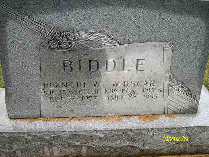 Oscar Biddle is the 56 year old white male head of household, who owns his home, valued at $800. Born in Indiana, he and his wife lived in the same house in 1935. Educated through 8th grade, he works of his own account as a farmer on his farm, working 84 hours the last week of March, and in 52 weeks of work had no wages in 1939, but had other income over $50. His wife, 55 year old Blanche W. Biddle, was born in Indiana, as were her parents, was educated through 3 years of high school, and does home housework.