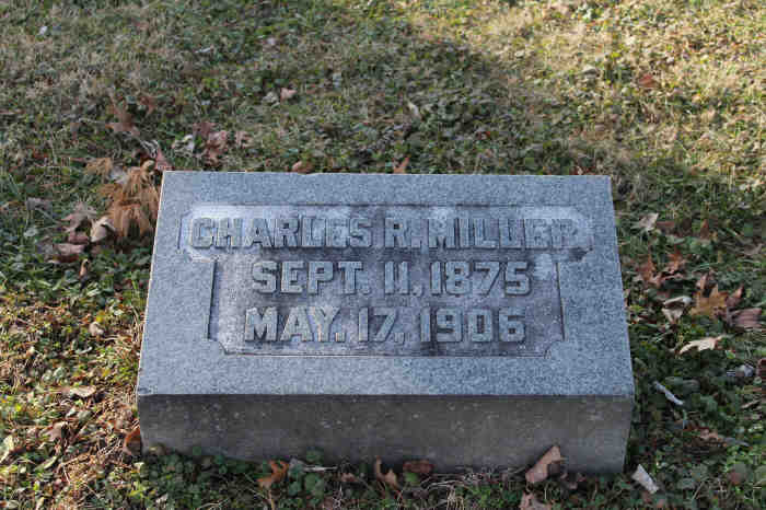 Charles R. Miller, a white male married dairy man, was born Aug 10, 1875 in Indiana. He died May 17, 1906 in Lawrenceburg, Dearborn, Indiana, at the age of 30 years, 9 months, 8 days. His father was Job Miller of Indiana. His mother was Rachel Whipple of Ohio. Cause of death was tuberculosis and exterior asthemia. Burial to take place May 20, 1906 in Greendale.