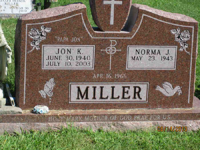 John Kenneth Miller, a 63 year old male married veteran, passed away on July 10, 2003 at his residence, 5410 Lincoln Avenue, Evansville, Vanderburgh, Indiana. He was born 6/30/1940 in Hammond, Indiana to Raymond F. Miller and Marguerite Jasnowski. The informant for the certificate is John's wife, Norma J. Boldry Miller, same address. Per Dr. Donald R. Brake Jr., John died of ependymoma (a tumor of the brain or spinal cord), due to metastic spinal cancer and increased entracranial pressure. The embalmer was Gregory C. Betz, the funeral home was Miller & Miller Colonial Chapel, and the burial place on 7/14/2003 was St. Joseph Catholic Church in Evansville.