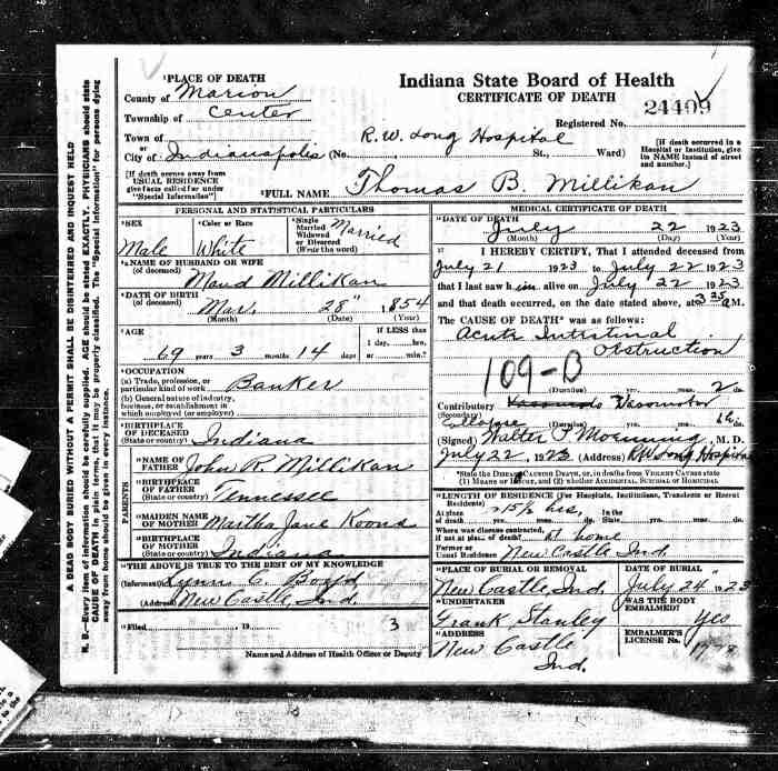 Thomas B. Millikan, a white male married banker, was born Mar. 28, 1854 in Indiana, and died July 22, 1923 in R. W. Long Hospital, Center township, Indianapolis city, Marion county, Indiana, at the age of 69 years, 3 months and 14 days. Informant was Lynn G. Boyd of New Castle, Indiana. Father was John R. Millikan of Tennessee, and mother was Martha Jane Koons of Indiana. Cause of death was acute intestinal obsctruction with contributory vasomotor collapse. Date of burial July 24, 1923 in New Castle, Indiana.
