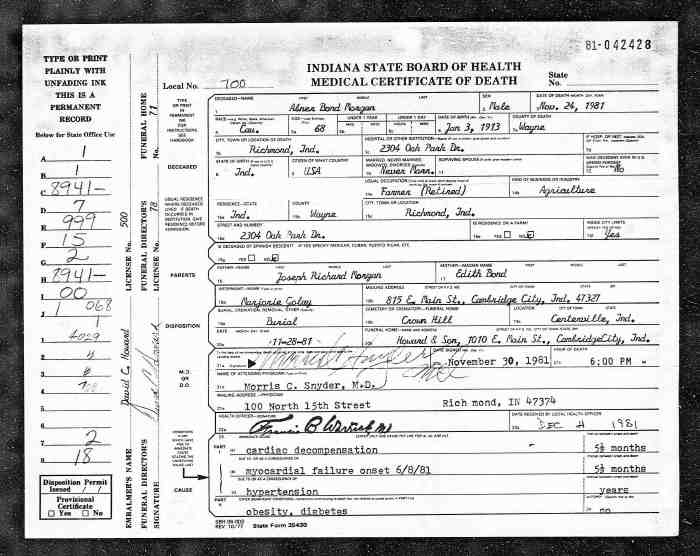 Abner Bond Morgan, a caucasian male farmer (retired) was born Jan 3, 1913 in Indiana, and died Nov 24, 1981 at his home, 2304 Oak Park Dr., Richmond, Wayne, Indiana at 68 years old. He was never married. Informant was Marjorie Golay, 815 E. Main St., Cambridge City, Indiana 47327. Abner's parents were Joseph Richard Morgan and Edith Bond. Burial to take place 11/28/1981 at Crown Hill Cemetery in Centerville, Indiana. Cause of death was cardiac decompensation due to myocardial failure onset 6/8/1981, also due to hypertension, obesity and diabetes.