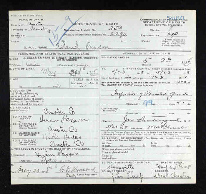 Roland Paxson, a white male, was born 5/3/1918 in Pennsbury, Chester, Pennsylvania, and died there 21 days later on 5/23/1918 due to infection of Parotid gland. The father was Hiram Paxson of Chester Co. The mother was Viola Hayes of Chester Co. Informant was Hiram Paxson. Burial to take place May 24, 1918 in Unionville.