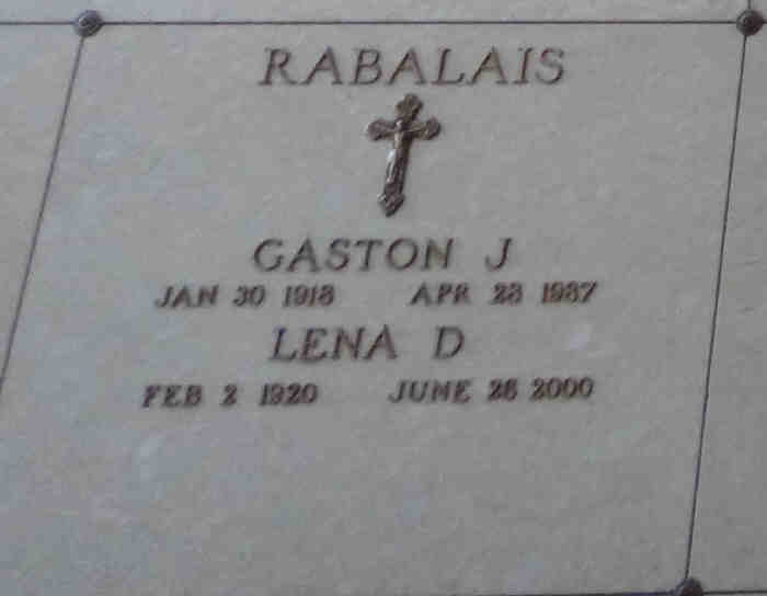 Gaston Joseph Rabalais on Tuesday, April 28, 1987 at 10:45 a.m. Age 69 years. Beloved husband of Lena Daigrepont Rabalais. Father of Clara Jane Rabalais Roberts and Rose Marie Rabalais Capretto. Brother of Percy Rabalais, Daisy Rabalais Johnson, Zepher Rabalais Bordelon and the late Edward Rabalais and Norris Rabalais Grandfather of Mark, Julie, and Stephen Roberts and Christopher Capretto.