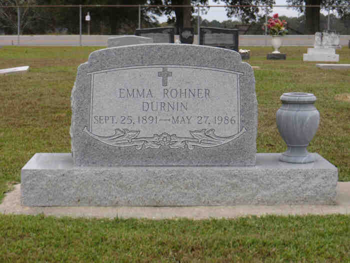 Died 6:03 p.m. Tuesday, May 27, 1986, at Seventh Ward General Hospital, Hammond. She was 94, a native of St. Helena Parish and resident of Hillsdale. Visiting at McKneely Funeral Home, Amite, 8 to 10:40 a.m. Thursday. Religious services at St. Helena Catholic Church, Amite, 11 a.m. Thursday, conducted by the Rev. John O'Connell. Burial in Roberts Cemetery, Hillsdale. Survived by four daughters, Mrs. Marguerite D. Silbernagel, Mrs. Bertha D. Davis, and Mrs. Virgie Mae D. Courtney, all of Amite,and Mrs. Melba D. Smith, Greensburg; a son, Norman O. Durnin, Amite; 17 grandchildren; 37 great-grandchildren; and five great-great-grandchildren. Preceded in death by husband, John E. Durnin; and a son, Ray E. Durnin.