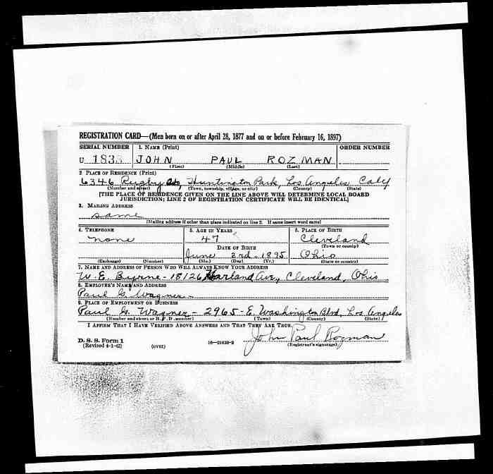 John Paul Rozman is 47 years old, born June 3, 1895 in Cleveland Ohio. He resides at 6346 Rugby, Huntington Park, Los Angeles, Calif and he has no phone number. The person who will always know his address is W. E. Byrne, 18126 Harland Ave, Cleveland, Ohio. He works for Paul G. Wagner, 2965 E. Washington Blvd., Los Angeles.He is described as white race, 5'10" tall, 138 lbs., brown eyes, gray hair, dark complexion, with a woman's head - initials - M.P.V. on left shoulder.