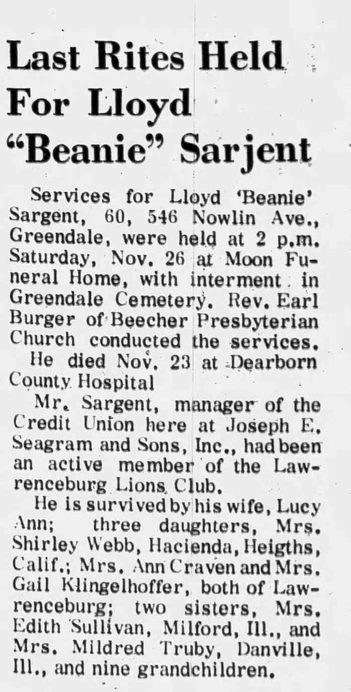 Services for Lloyd 'Beanie' Sargent, 60, 546 Nowlin Ave., Greendale, were held at 2 p.m. Saturday, Nov. 26 at Moon Funeral Home, with interment in Greendale Cemetery. Rev. Earl Burger of Beecher Presbyterian Church conducted the services.