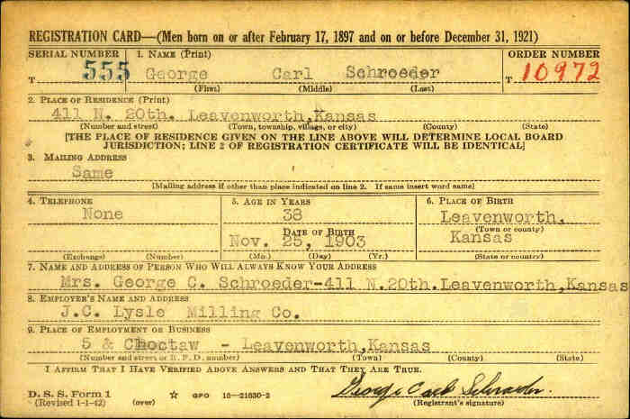 George Carl Schroeder is 38 years old, born Nov. 25, 1903 in Leavenworth, Kansas. He resides at 411 N. 20th, Leavenworth, Kansas, and he does not list a phone number. The person who will always know his address is Mrs. George C. Schroeder, same residence. George works for J. C. Lysle Milling Co., 5 & Choctaw, Leavenworth, Kansas. He is described as white race, 5'11" tall, 190 lbs., blue eyes, gray hair, ruddy complexion.