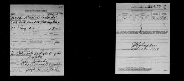 Joseph Nicholas Sostoski is 18 year old, born Aug 23, 1900. A white native born citizen, he resides at 309 East Broad St., West Hazleton, Luzerne, Pennsylvania. His present occupation is munitions plant Jeansville Iron Works, employer name Worthington Pump[?] Co in Hazleton. His nearest relative is John Sostoski [his father] same address. Joseph is described as medium height and build, gray eyes and light hair.