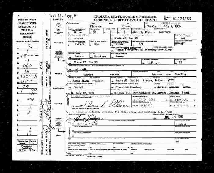 Florence Hirman, a white female, was born Dec 23, 1895 in Indiana. A widow, retired from employment at Schenley Distillery, she resided in Route #2 Box 90, Aurora, Dearborn, Indiana. She died July 9, 1986 in Aurora, Dearborn, Indiana at the age of 90 years. The informant is her grandson, Robin Allen same address. Her parents are Edward Sparks and America Ann Sterling. Cause of death was cardiac arrest. Burial to take place July 12, 1986 in Riverview Cemetery, Aurora, Indiana.