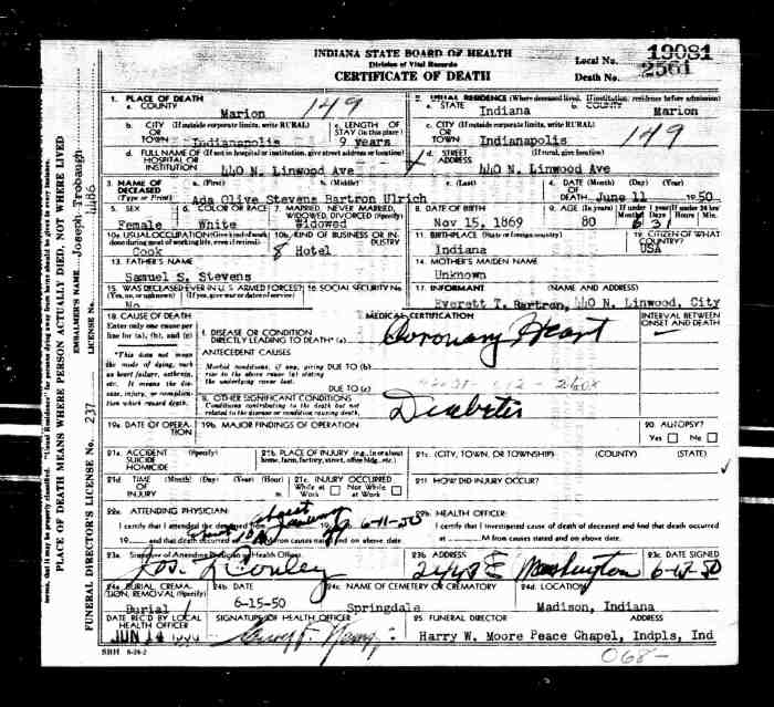 Ada Olive Stevens Bartron Ulrich, a white female widow, was born Nov 15, 1869 in Indiana. Her occupation was cook in a hotel. Her father was Samuel S. Stevens. Her mother was unknown. Ada died June 11, 1950 in her home at 440 N. Linwood Ave., Indianapolis, Marion, Indiana, at the age of 80 years, 6 months, 31 days.Cause of death was coronary heart, with diabetes. Burial to take place 6-15-1950 in Springdale cemetery in Madison, Indiana.