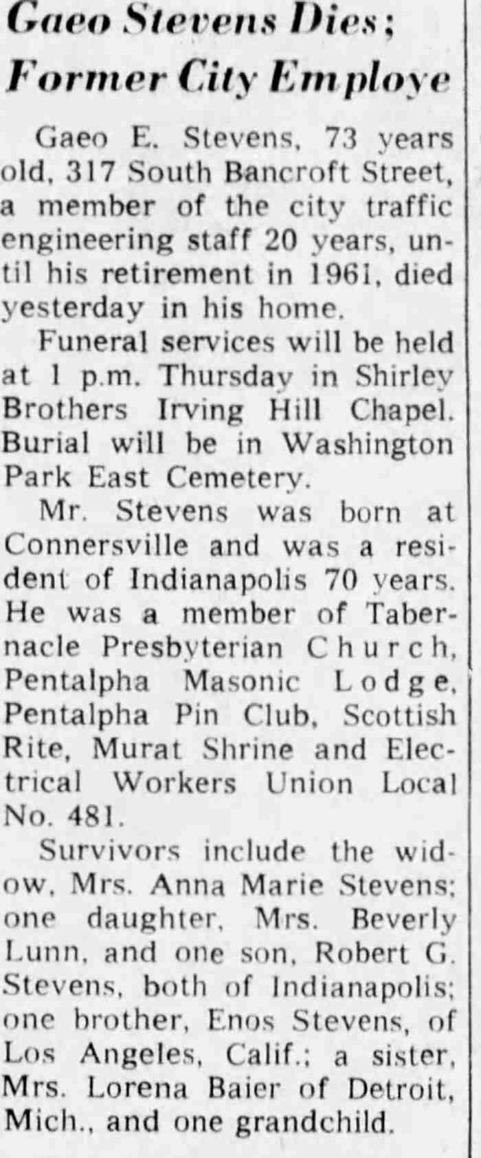 Mr. Stevens was born at Connersville and was a resident of Indianapolis 70 years. He was a member of Tabernacle Presbyterian Church, Pentalpha Masonic Lodge, Pentalpha Pin Club, Scottish Rite, Murat Shrine and Electrical Workers Union Local No. 481.
