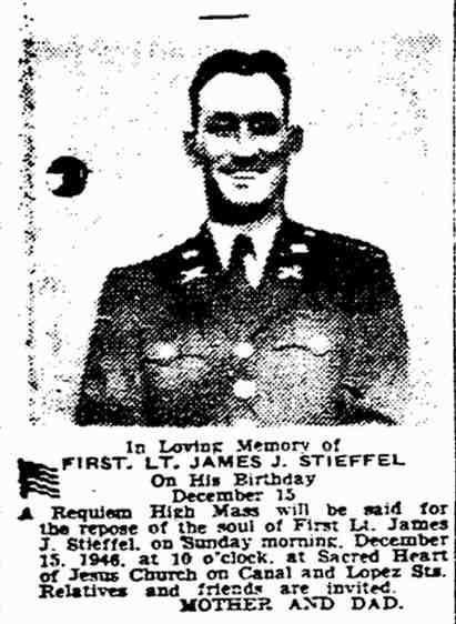 A Requiem High Mass will be said for the repose of the soul of First Lt. James J. Stieffel, on Sunday morning, December 15, 1946, at 10 o'clock, at Sacred Heart of Jesus Church on Canal and Lopez Sts. Relatives and friends are invited.
