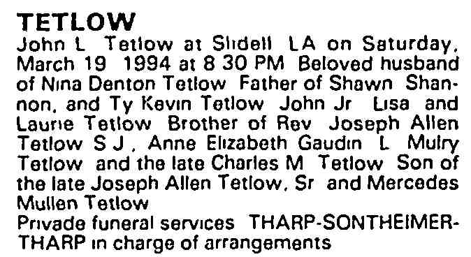 John L Tetlow at Slidell LA on Saturday, March 19, 1994 at 8:30 PM Beloved husband of Nina Denton Tetlow, Father of Shawn Shannon, and Ty Kevin Tetlow, John Jr, Lisa and Laurie Tetlow Brother of Rev Joseph Allen Tetlow S. J., Anne Elizabeth Gaudin, L Mulry Tetlow and the late Charles M Tetlow, Son of the late Joseph Allen Tetlow, Sr and Mercedes Mullen Tetlow.