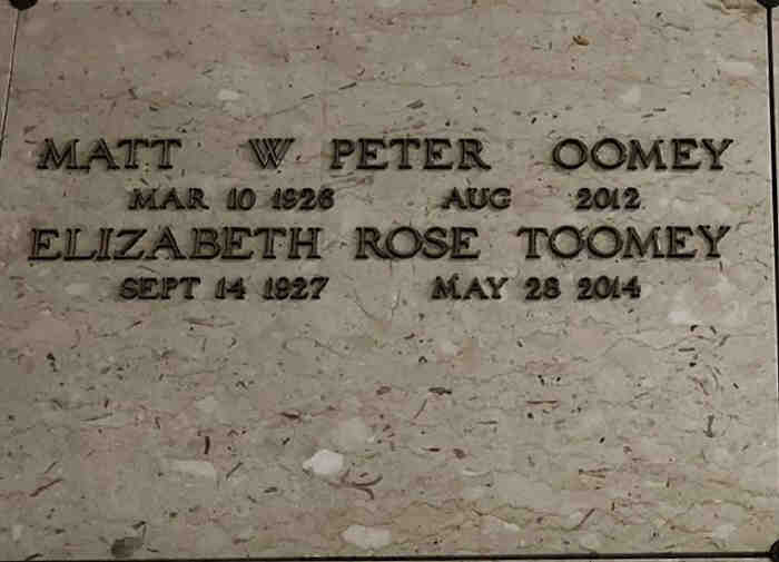 Father: Matthew Charles Toomey Jr. {Find A Grave ID: 204411000} Mother: Bertha Peters {Find A Grave ID: 204824237}