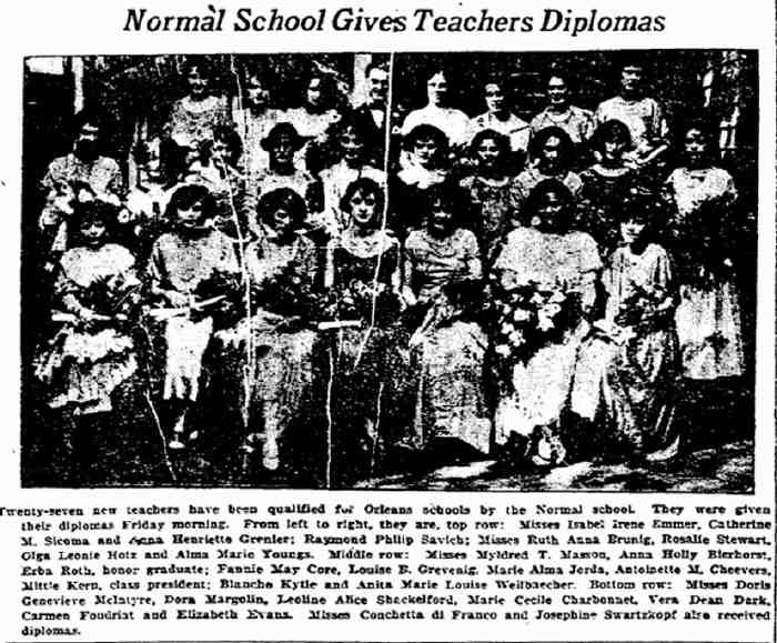 Twenty-seven new teachers have been qualified for Orleans schools by the Norman school. They were given their diplomas Friday morning. From left to right, they are, top row........ middle row....... and Anita Marie Louise Weilbaecher. Bottom row.......