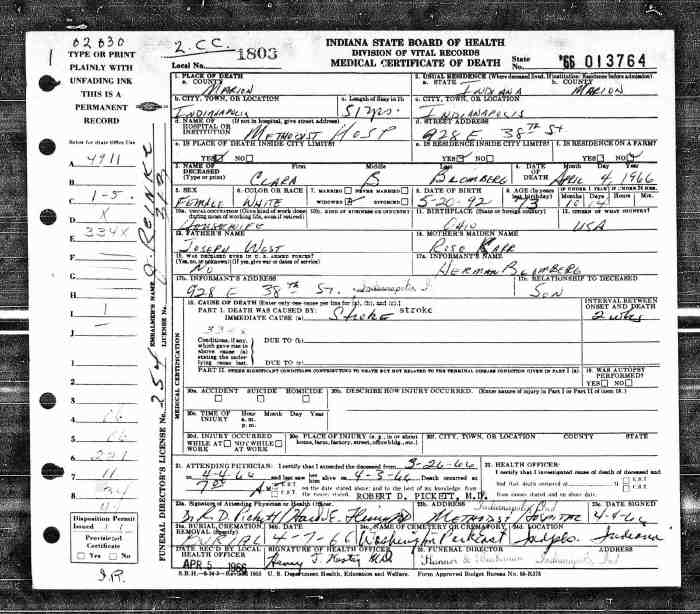 Clara B. Blomberg, a white female housewife, was born May 20, 1892 in Ohio. She died April 4, 1966 in Methodist Hospital in Indianapolis, Marion, Indiana at the age of 73 years, 10 months and 14 days. Her father, was Joseph West, her mother was Rose Karr. Cause of death was stroke. Burial to take place 47/1966 in Washington Park East Cemetery in Indianapolis.