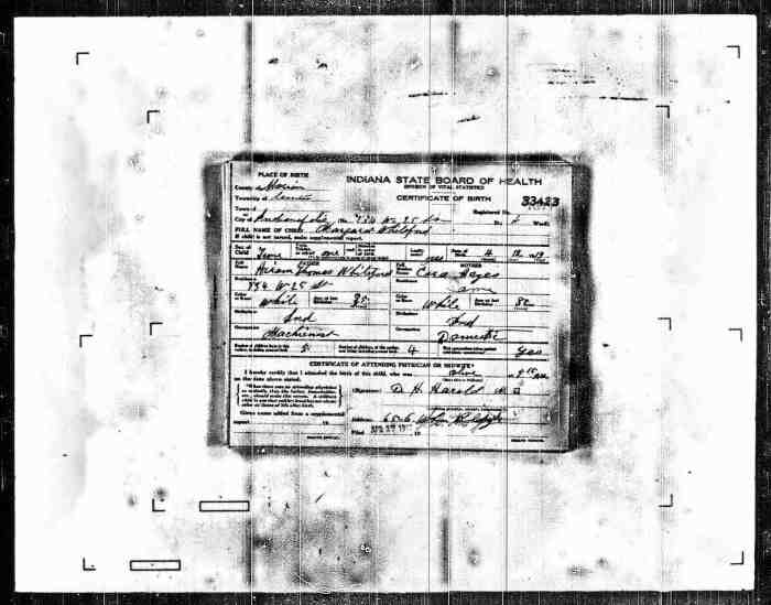Margaret Whiteford was born 4/12/1913 in Indianapolis, Marion, Indiana. A white legitimate female, her father was Hiram Thomas Whiteford, 35, of 734 W 25th, was born in Indiana and is a machinist. Her mother was Cora Hayes, white, 32, occupation domestic.