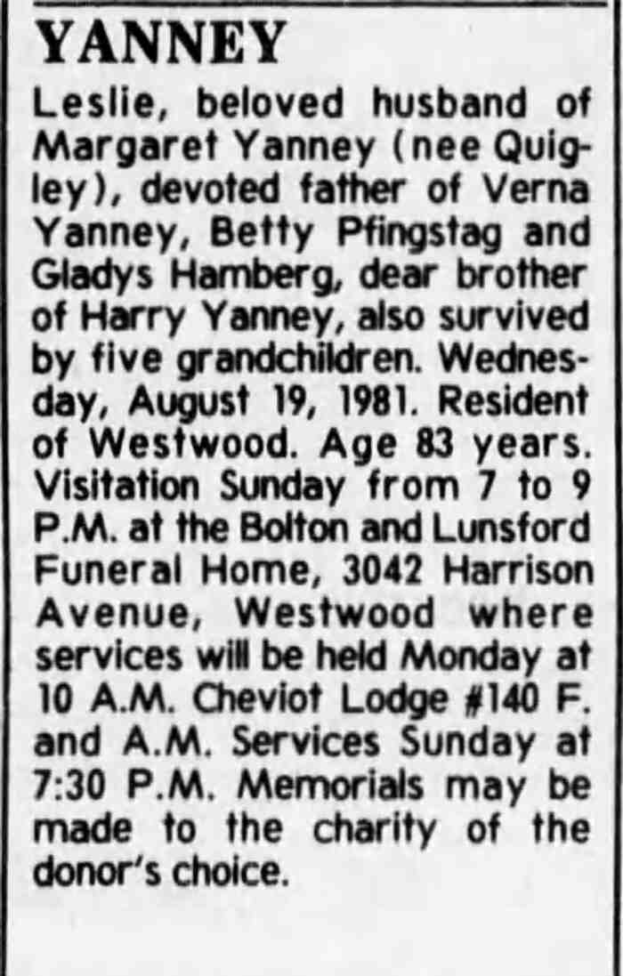 Leslie, beloved husband of Margaret Yanney (nee Qulgiey). devoted father of Verna Yanney, Betty Pfingstag and Gladys Hamberg, dear brother of Harry Yanney, also survived by five grandchildren, Wednesday, August 19, 1981. Resident of Westwood. Age 83 years. Visitation Sunday from 7 to 9 P. M. at the Bolton and Lunsford Funeral Home, 3042 Harrison Avenue, Westwood where services will be held Monday at 10 A. M., Cheviot Lodge #140 F. and A.M. Services Sunday at 7:30 P.M. Memorials may be made to the charity of the