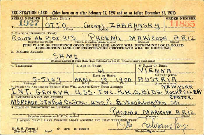Otto Zabransky is 41 years old, born April 18, 1900 in Vienna, Austria. His address is Route #6, Box 913, Phoenix, Maricopa, Arizona, and he does not have a telephone. The person who will always know his address is Int.Geneva Ass., Inc., R.K.O. Bldg., Rockfeller Center, New York. His employer is Mercado Seafood Co., Inc., 432½ E. Washington St., Phoenix, Maricopa, Arizona. Otto is described as white race, 5'11" tall, 165 lbs., gray eyes, brown hair, light complexion, scars on left hand and right side under nose.