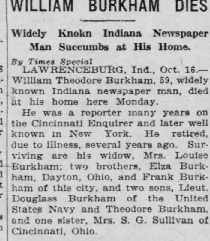 He was a reporter many years on the Cincinnati Enquirer and later well known in New York. He retired due to illness, several years ago. Surviving are his widow, Mrs. Louise Burkham; two brothers, Elza Burkham, Dayton, Ohio. and Frank Burkham of this city, and two sons. Lieut. Douglass Burkham of the United States Navy and Theodore Burkham, and one sister. Mrs. S. G. Sullivan of Cincinnati, Ohio.