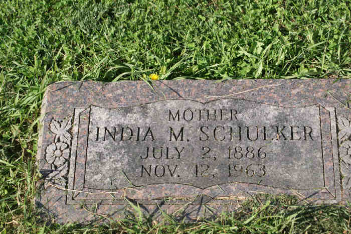 India Myrtle Sohulker was born July 2, 1886 in Kenton Co., Kentucky, and died on Nov 12, 1963 at her residence, 5218 Bell Dr., Independence, Kenton, Kentucky, at the age of 77 years, 4 months and 10 days. Per informant, Mrs. William Collins, her