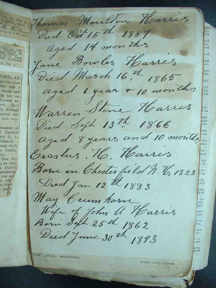 wife of John Adam Harris "First wife May Crumhorn was born 25 September 1862 in New Orleans, LA, and died 30 June 1893 at 939 Constance St., New Orleans, LA (eclampsia). Burial was 1 July 1893 in Lafayette Cem. #1, Harris Family Tomb. They were married 2 August 1887 in New Orleans, LA"