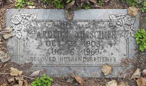 Harold Ahlschier was born Oct. 22, 19+03 in Galveston, Texas, and was found dead Aug. 11, 1969 in his residence at 4823 Falvey, Houston, Harris, Texas. A white widowed male, he was a driver for Yellow Transit. His father was Otto Ahlschier and his mother was Molly Fogarty. Informant by phone was Joseph Ahlschier.