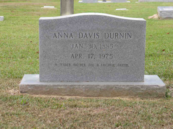 Survived by three sons, John A. and Arnold D. Durnin, both of Greensburg, and A. K. Durnin Baton Rouge; two daughters, Mrs. W. A. (Gladys) McGehee, Pride, and Mrs. Jack F. (Ruth) Herbert, Hammond; 24 grandchildren, 50 great-grandchildren and 11 great-great-grandchildren. Preceded in death by her husband, Alex J. Durnin, a son, Davis Durnin, two daughters, Miss Ella Durnin and Mrs. Mildred Rohner, and a grandson, Joe Durnin. Pallbearers will be grandsons, John Durnin Jr., Jack Herbert, Billy McGehee, Douglas, Jerry and Terry Durnin, Clarence, Ellzey, Glenn, Elton, Floyd, Joe and James Rohner.