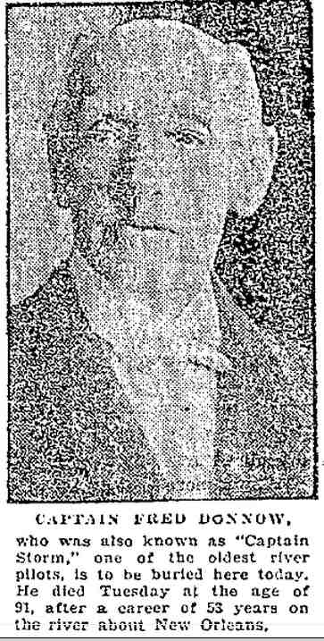 CAPTAIN FRED DONNOW, who was also know as "Captain Storm," one of the oldest river pilots, is to be buried here today. He died Tuesday at the age of 91, after a career of 53 years on the river about New Orleans. [Photo]