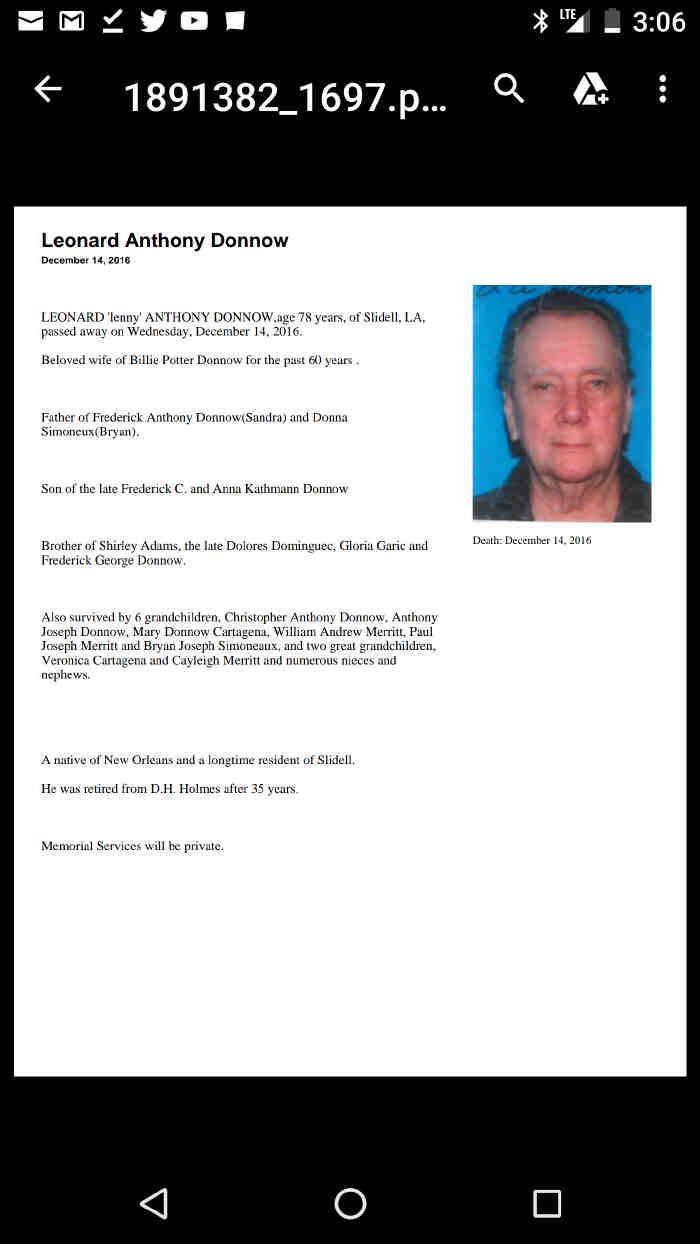 Birth Date: Abt 1938 - New Orleans, Orleans, Louisiana, USA Christening: Death: 14 Dec 2016 - Slidell, St. Tammany, Louisiana, United States ( about age 78) Burial: Cause of Death: Find A Grave ID: 197964945