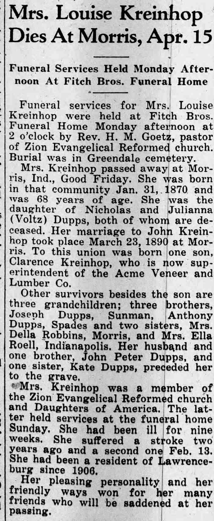 Mrs. Kreinhop passed away at Morris, Ind., Good Friday. She was born in that community Jan. 31,.1870 and was 68 years of age. She was the daughter of Nicholas and Julianna (Voltz) Dupps, both of whom are deceased. Her marriage to John Kreinhop took place March 23, 1890 at Morris. To this union was born one son, Clarence Kreinhop, who is now superintendent of the Acme Veneer and