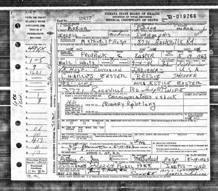 Fredrick S. Easter, a white male, was born 9-4-1901 in Indiana. He died 5-19-1963 in Methodist Hospital, Indianapolis, Indiana. His residence was 3771 Rockville Rd., Indianapolis, Marion, Indiana, at the age of 61 years, 8 months and 15 days. His usual occupation was V. A. Hospital custodian. His parents are Charles Easter and Bessie Shearer. Informant was Mrs. Estile Easter, same address. Cause of death was carcinimatosis shock due to primary right lung. Burial to take place 5-19-1963 in Floral Park Cemetery, indianapolis, Indiana.