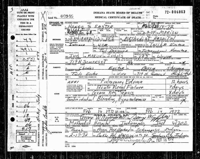 Henry S. Easter, a white male, was born 2-9-1909 in Indiana. He died 2-14-1972 in Methodist Hospital, Indianapolis, Marion, Indiana, at the age of 63. His surviving spouse is Twila Easter. She is the informant, and resides at his address. Henry's usual occupation was test designer for International Harvester. His residence was 719 N. Somerset, Wayne, Indianapolis, Marion, Indiana. His parents are Charles Easter and Bessie Shearer. Cause of death was pulmonary edema (12 hours) with acute renal failure (7days) and gram neg sepsis (8 days), along with gastrointestinal bleeding and hyponatremia. Burial to take place 2-17-1972 at Floral Park Cemetery, Indianapolis, Indiana.
