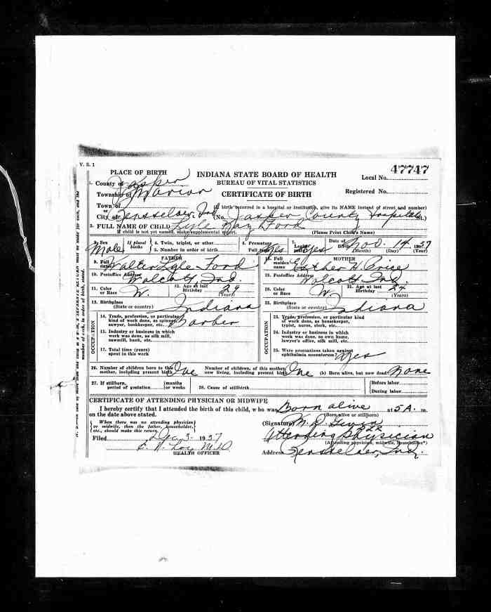 Lyle Kay Ford, a white legitimate male, was born Nov 14, 1937 in Rensselaer city, Marion township, Jasper county, Indiana. His father, Walter Lyle Ford, was 29, born in Indiana, residing in Wolcott, Indiana, occupation barber. His mother, Esther H. Price, was 24, born in Indiana, residing in Wolcott, Indiana.