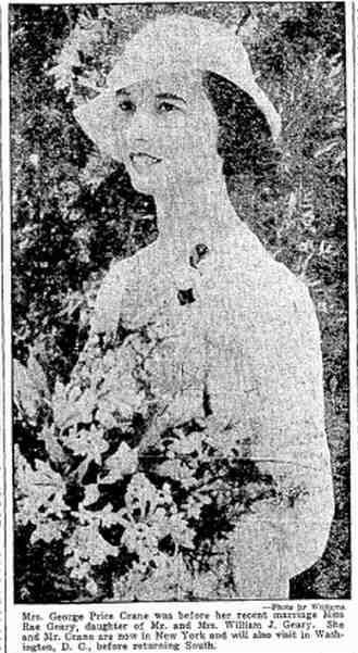 In the presence of a large gathering of relatives and friends, Miss Rae Geary, second daughter of Mr. and Mrs. William Joseph Geary, was married Tuesday morning to Mr. George Price Crane, son of Mr. and Mrs. Warren Crane. The ceremony took place at 9:30 o'clock mass at St. Mathias church, on Broad street, near Napoleon avenue, with the Reverend Father Eugene O'Conner of Loyola university officiating.