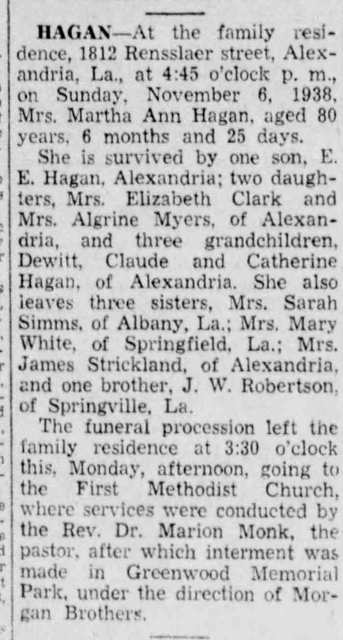 HAGAN - At the Family residence, 1812 Rensslaer street, Alexandria, La., at 4:45 o'clock p. m. on Sunday, November 6, 1938, Mrs. Martha Ann Hagan, aged 80 years, 6 months and 25 days.