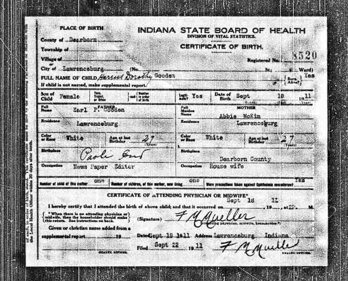 Harriet Dorothy Gooden, a white female, was born Sept 18, 1911 in Lawrenceburg, Dearborn, Indiana, where her parents reside. Her father is Earl P. Gooden, 27, born in Paoli, Indiana, a news paper editor. Her mother is Abbie McKim, 27, born in Dearborn county, a house wife.