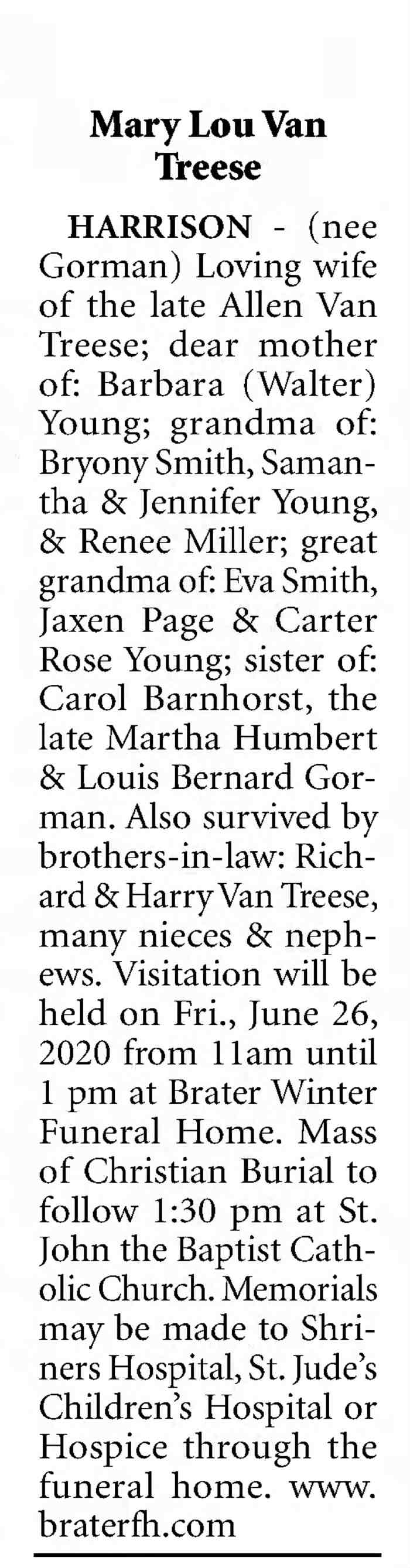 HARRISON - (nee Gorman) Loving wife of the late Allen Van Treese; dear mother of: Barbara (Walter) Young; grandma of: Bryony Smith, Samantha & Jennifer Young &: Renee Miller; great grandma. of: Eva Smith, Jaxen Page & Carter Rose Young; sister of: Carol Barnhorst, the late Martha Humbert & Louis Bernard Gorman. Also survived by brothers-in-law: Richard & Harry Van Treese, many nieces & nephews. Visitation will be held on Fri., June 26, 2020 from 11am until 1 pm at Brater Winter Funeral Home. Mass of Christian Burial to follow 1:30 pm at St. John the Baptist Catholic Church. Memorials may be made to Shrincrs Hospital, St. Jude's Children's Hospital or Hospice through the funeral home. WWW.braterfh.com