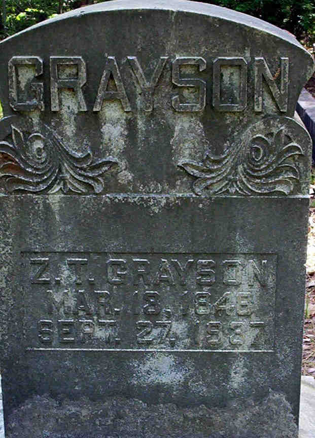 "Z. T. Grayson, the efficient postmaster of Prescott, was born in Hamilton County, Tenn., March 13, 1848. His father, John Grayson, also a native of Hamilton County, Tenn., was married in his native State to Miss Sallie Fricks, and remained in Hamilton County, Tenn., after his marriage until 1861, when he removed to Ouachita County, Ark., where he successfully engaged in agricultural pursuits, and accumulated considerable property. He served as sheriff for fifteen or twenty years, and after coming to Arkansas served several terms as treasurer of Ouachita County. He died in this county at his home, in 1882, in his sixty-third year; his wife, who was seven years his elder, died in 1873, a member of the Cumberland Presbyterian Church. Mr. Grayson was Mason of high standing, having taken some of the higher degrees. In politics he was first a Whig, afterward a Republican, and during the late war was a Union man. There were born to his marriage eight sons and three daughters, four sons and two daughters still living, viz: James (was killed in Price's raid through Missouri), Francis (the eldsest, died in Ouachita County, in his fortieth year), Elizabeth (was the wife of John C. Alexander, of Ouachita County), Jack (died when a young man, in Tennessee), Henry L. (is a farmer of Ouachita County), George W. (is engaged in tilling the soil in Washington), Thomas J. (is a farmer of Ouachita County), and J. T. (is the subject of this sketch). Seven of these sons served in the Confederate army, doing active and credible service.