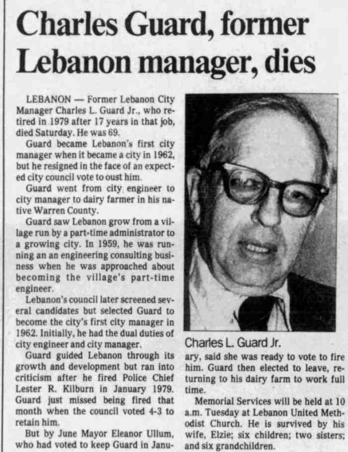 Guard guided Lebanon through its growth and development but ran into criticism after he fired Police Chief Lester R. Kliburn in January 1979. Guard just missed being fired that month when the council voted 4-3 to retain him.