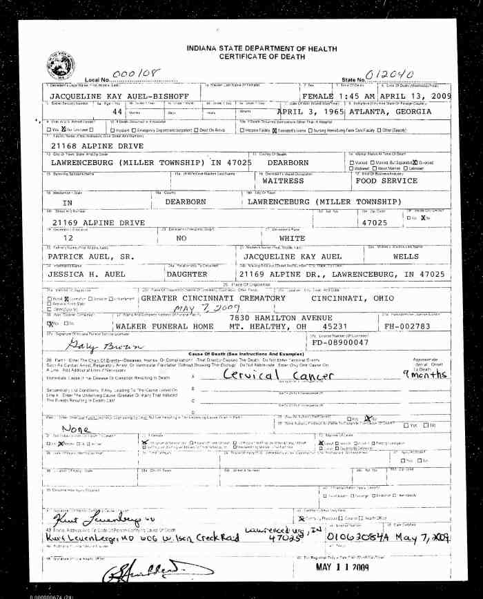 Jacqueline Kay Auel-Bishoff, a white female, was born April 3, 1965 in Atlanta, Georgia, and died April 13, 2009 at the age of 44 in her home at 21169 Alpine Drive, Lawrenceburg (Miller Township) Dearborn, Indiana. She was educated through 12th grade and her occupation was waitress in the food service industry. The informant is her daughter, Jessica H. Auel, same address. The parents are Patrick Auel, Sr. and Jacqueline Kay Auel. Cause of death was cervical cancer, duration 9 months. The body is to be cremated May 7, 2009 at the Greater Cincinnati Crematory, Cincinnati, Ohio.